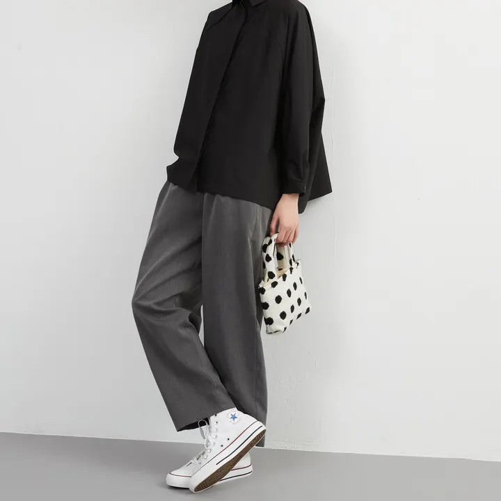 特徴 このスラックスは、ゆったりとしたカーブルーズシルエットが特徴です。ウエストにはゴムが入っており、履きやすさとハリメリ感が抜群です。オフィスや普段のカジュアルにもぴったりなデザインで、美脚ラインを演出。両サイドポケット付き。 生地の特徴 高品質なポリエステルとレーヨンの混紡素材を使用しています。滑らかな肌触りで、シワになりにくい特性があります。適度な厚みがあり、季節を問わず快適に着用できます。また、軽量で通気性も良く、長時間の着用でも快適さが続きます。 コーディネートの提案 このスラックスは、ブラウスやシャツと合わせて、オフィスコーデや普段のカジュアルスタイルに最適です。シンプルなトップスをインしてウエストラインを強調すると、スタイルアップ効果がさらに高まります。足元にはパンプスやローファーを合わせて、上品な印象を演出しましょう。カジュアルなシーンでは、Tシャツやスニーカーと合わせてリラックスしたコーディネートも楽しめます。 【注意点】 ※撮影商品はサンプルの為、実際の仕様と異なる場合がございます。 ※画像の商品は光の照射や角度、お使いのモニター環境により、実物と色味が異なる場合がございます。スタジオ物撮りの画像が実物の色味に一番近くなっております。 ※予約商品の場合、お届け予定はあくまでも目安となります。 生産の都合上、お届け時期がずれる場合がございますので、あらかじめご了承ください。 ※表記サイズは商品の実寸です。 ※布製品の特性上、サイズ表の実寸法は多少の誤差が生じる場合がございますので、予めご了承ください。 #定番#ボトムス#パンツ#カーブパンツ#リラックスパンツ#オフィススタイル#美脚パンツ#カジュアル#スラックス#パンツ#ズボン#ウエストゴム#ポケット