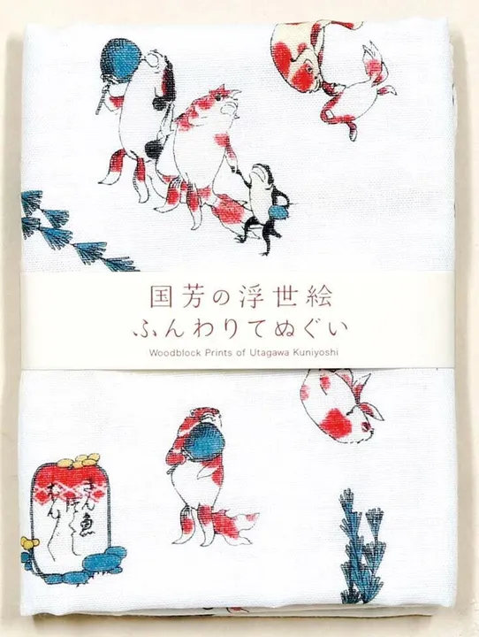 国芳の浮世絵 ふんわり二重ガーゼ手拭い 江戸時代の浮世絵師「歌川国芳」の浮世絵を、手拭いに描いた商品です。ふんわりとした肌触りや吸水性の良い、二重ガーゼ素材を使用。安心の日本製です。 「歌川国芳」は、江戸時代末期を代表する浮世絵師の一人であり、斬新なデザイン力・奇想天外なアイデアで、幅広い魅力を持つ人気の高い浮世絵師です。猫好きでも有名で、数々の猫をモチーフにした浮世絵を描いています。 歌川国芳「金魚」 国芳ならではの、金魚の流麗な美しさや愛らしさを描いた浮世絵です。江戸時代の風刺:金魚の船頭さんには、「とりいのばか」の隠し文字があり、ユーモア溢れる国芳を代表する浮世絵です。