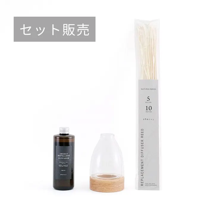 香りで空間を快適にするディフューザーと、美しいフラワーベースのセットです。 セットには、ディフューザー本体、ディフューザーを入れ替えるフラワーベース、ラタンとウィローのリードが含まれています。 使用しているエッセンシャルオイルは天然植物由来。古くから虫よけとして活用されてきた忌避作用を持つ香りを中心に、すっきりとした心地よい香りにブレンドしました。天然成分なので、安心して室内でお使いいただけます。 フラワーベースはリューズガラスとウッドの組み合わせで、ガラス部分と土台のウッドは簡単に取り外し可能。水替えやお手入れも手軽です。 ウッドベースには美しい木目が特徴のオーク材を使用しており、ナチュラルで上品な雰囲気がインテリアと自然に調和します。 香りで虫を寄せ付けにくくしながら、優しい香りに包まれた心地よい空間づくりをお楽しみいただけるアイテムです。 【日本製/Made in Japan】