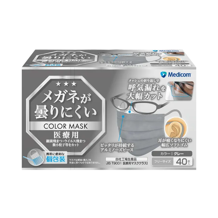 ”上部のメッシュシートでメガネが曇りにくい” ・JIS T9001 医療⽤マスク クラスⅠ適合マスクです。 ・アルミニウム製ノーズピースとマスクの内側に付けたメッシュの折り返しで呼気漏れを大幅にカットするアンチフォグ仕様です。 ・耳ひもには耳が痛くなりにくい柔らかい素材の幅広ソフトゴムを使用し、ポリエステル製(ラテックスフリー)のためアレルギーの方にも安心です。 ・持ち運びに便利な個包装タイプです。 ●入数 ・40枚/箱 ・40箱/ケース ノーズピース:アルミニウム 耳ひも:幅広ソフトゴム サイズ:フリー(約89×178mm) 製造:中国