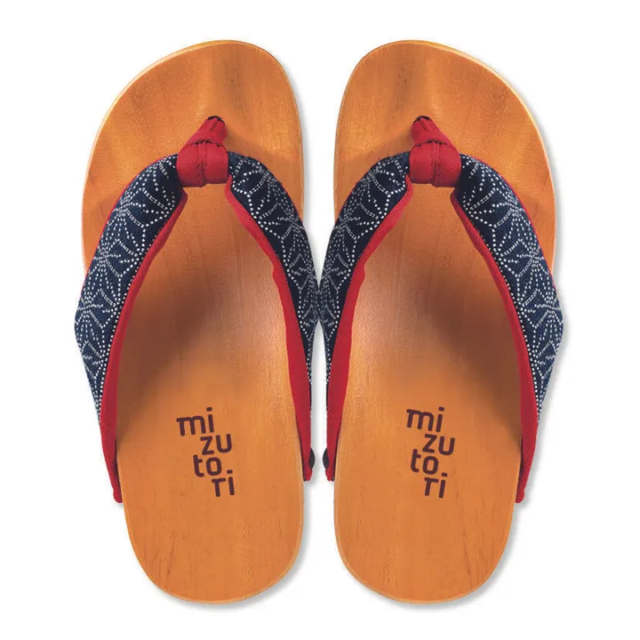 日本の伝統的な麻の葉文様の鼻緒。 表生地、裏生地ともに綿とポリエステルのジャガード織の生地を使用しています。 浴衣・作務衣はもちろん、デニムパンツやハーフパンツなどのコーディネイトもオススメです。
