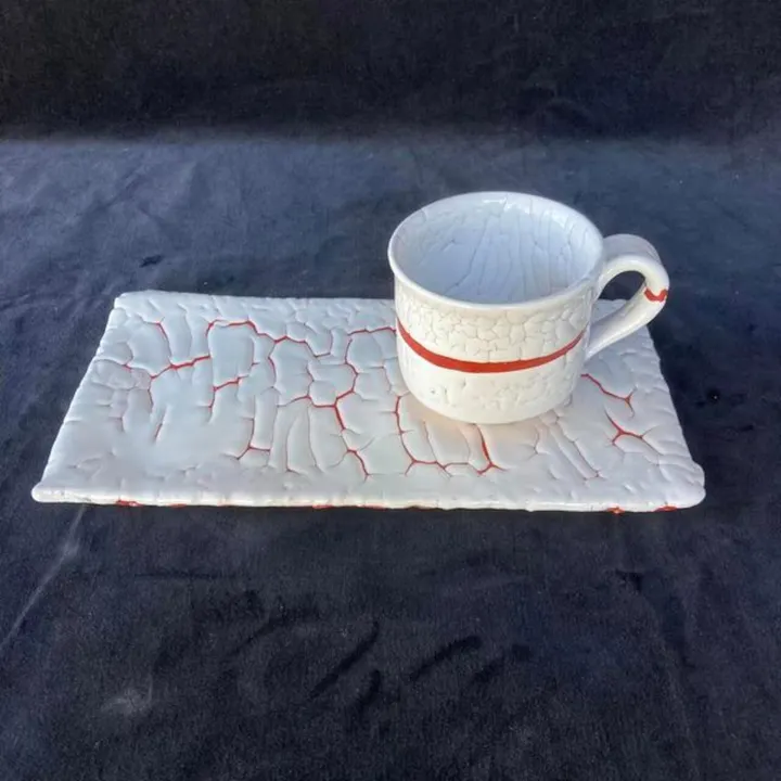 安定感のあるお皿とカップのコーディネート 皿など平らな平物に現われる大迫力の梅花皮(ちぢれ模様)は、 他の梅花皮にはない龍爪梅花皮だけの特徴です。 また赤の梅花皮を手がけている窯元は少なく非常に稀です。 龍の爪痕のような梅花皮(ちぢれ模様)はそれぞれに違い、同じものは出来ません。 個体差がある事をご了承ください。 ※電子レンジ・オーブン・食洗機 お使いいただけます。