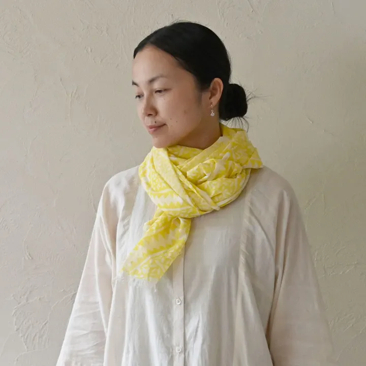 オーガニックコットンで密に手織りされたさらりとした生地のストール。 幾何学のような模様を手彫りで木のハンコにして、きれいにハンコを押すように手染めを施しました。 インドの手仕事の布から着想を得た柄、複雑な模様が首周りで華やかさを演出してくれます。