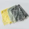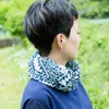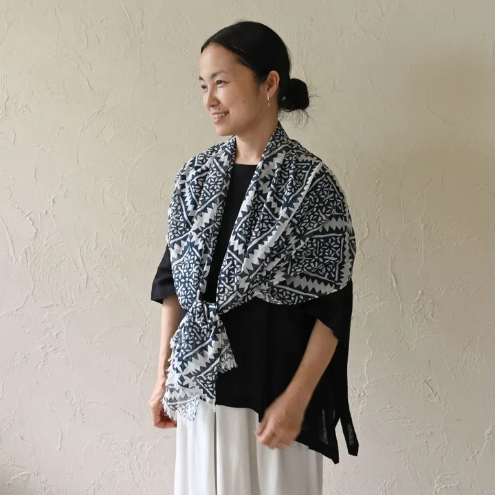 オーガニックコットンで密に手織りされたさらりとした生地のストール。 幾何学のような模様を手彫りで木のハンコにして、きれいにハンコを押すように手染めを施しました。 インドの手仕事の布から着想を得た柄、複雑な模様が首周りで華やかさを演出してくれます。