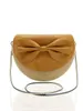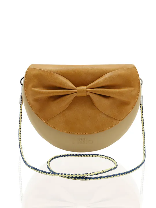 ◆優しいヘーゼルナッツブラウンのフレームを使った三日月型バッグ。ワンポイントにもなるリボン付きのフロントカバーは、フィオッコマスタードを採用することで丁度良い甘さに。ストラップはイエロー&ネイビーでカスタムバッグらしい味わいを表現しています。ハーフムーン(半月)型ショルダーバッグです。■構成部品 Frame:Hazelnut Brown Shoulder:Scubid - Cedar Cobalt Chiara In-Bag:Fiocco Mustard