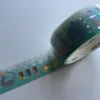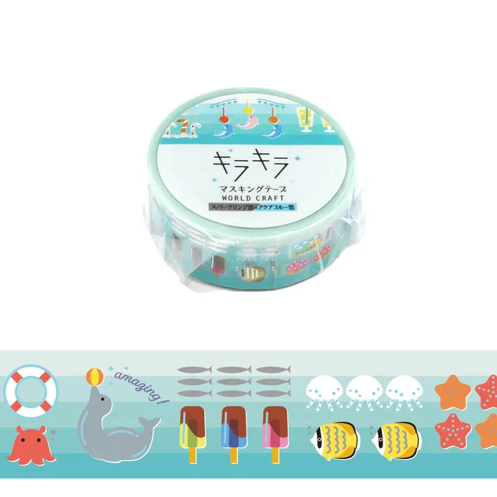 【 キラキラマスキングテープ 15mm Marine paradise】 ★★ 箔を使用した、キラキラが可愛いキラキラマスキングテープ 〜 第7弾 Seasons,Holiday,Cafeの3つをテーマに <12柄> を揃えました ★★ スパークリング箔とアクアブルー箔がのった水族館モチーフのデザイン♪ 水滴や海の生き物のつやつや感が箔で表現されておりこちらも切り取ってシールにできちゃう優れものです◎ 『スパークリング箔とアイスミント箔』 を使用しています♪