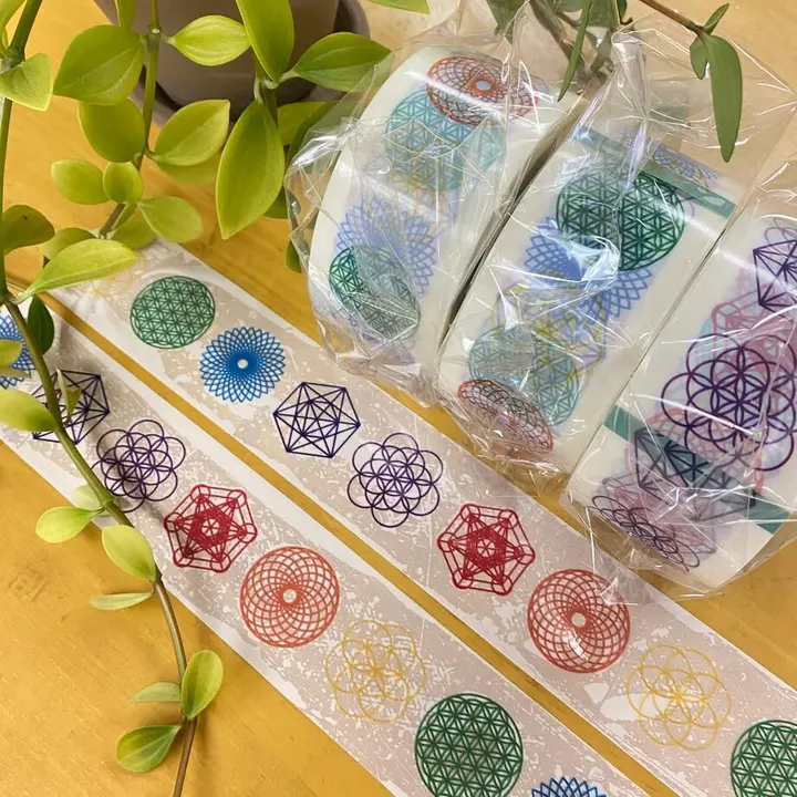 神聖幾何学7種類7色をOPPテープにしました! 素材OPP 原料ポリプロピレン 幅45㎜ 長さ40m かなり使いでがあります。 ⚠️あくまでもOPPテープです。神聖幾何学模様の副産物で体がゆるみ治療に使って効果が報告されていますが、荷造りに使うテープですので他は自己責任でお楽しみください。 ⭐️部屋の壁や床に貼ってイヤシロチに ⭐️背骨に貼ると体が整う! ⭐️痛いところに貼ると痛みが和らぐ ⭐️自転車やら電磁波よけに家電やらなんでもありあり 気持ちがいいんです。どこでもイヤシロチ計画!