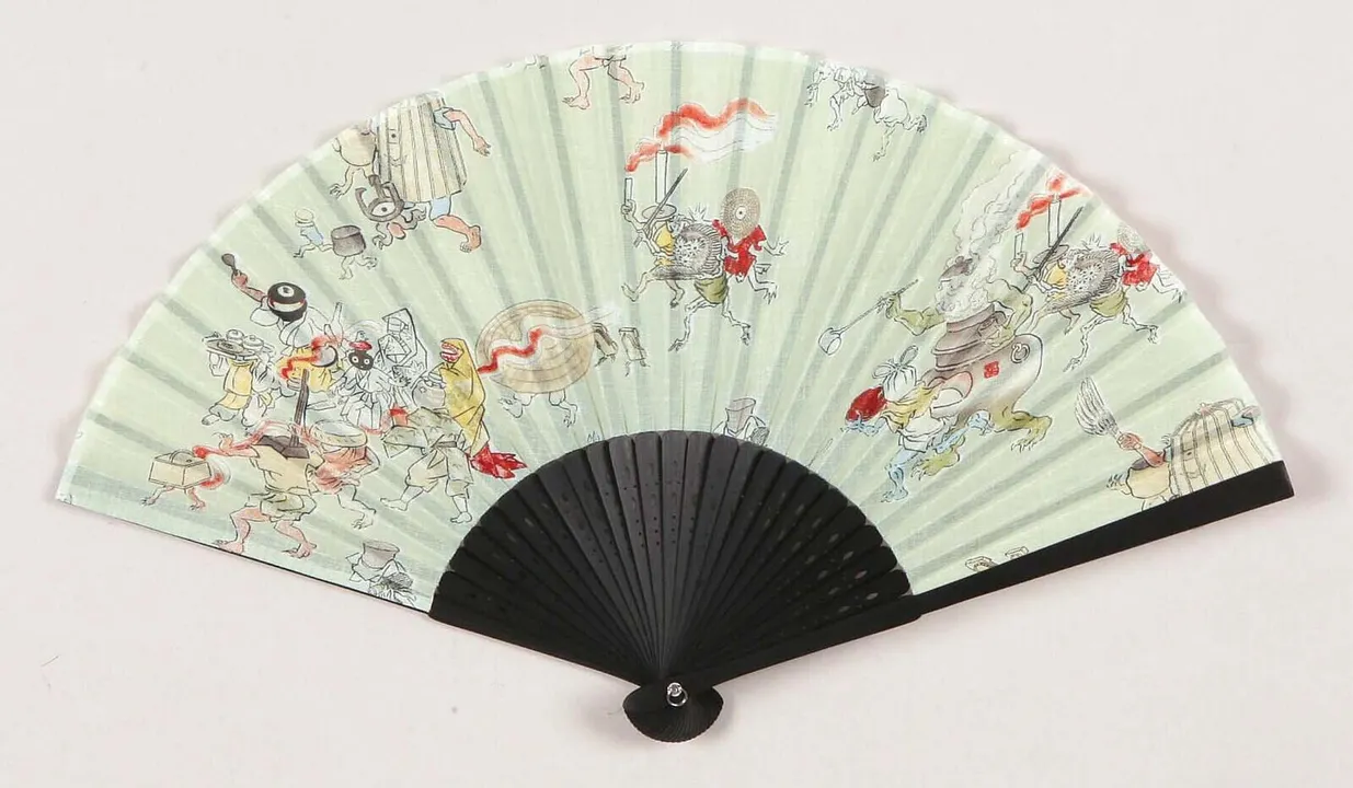 夏の和雑貨 扇子 布製 妖怪づくし 百鬼夜行 グリーン