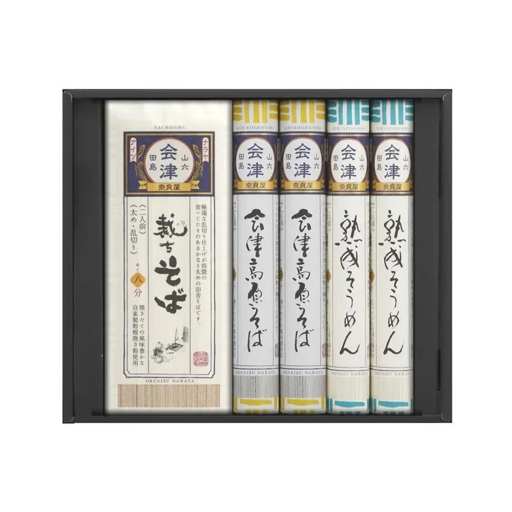 裁ちそば200g×3束 会津高原そば200g×2束 熟成そうめん200g×2束 包装・のし掛けも可能です。 別途紙袋をおつけいたします。