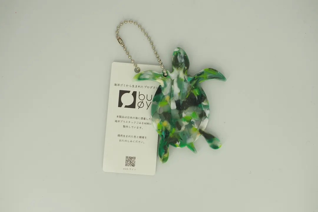 カメの形のキーホルダーです。 。 buoyの製品は全て日本各地で回収された海洋プラスチックごみを材料に作っています。着色などの加工を加えず、偶然海岸に漂着した色味でできています。 明るい発色が特徴のプラスチックですが、複数の色が交じり合うことでちょっと有機的なモザイク模様が特徴です。 製品にはひとつひとつゴミの漂着地域が明記されています。日本で起きている海洋ごみの問題をリアルに感じることができます。 また、商品に添付されているQRコードを読み込むとそれぞれの回収を行ったビーチクリーン団体さんの情報を見ることができます。 ------------------------------------------------------------------- 海洋プラスチックごみを材料に変える独自技術buoyの特徴 (buoyは海洋プラスチックごみ素材使用を前提にした株式会社テクノラボの独自技術により成形しています。株式会社テクノラボは本技術において特許取得済み) ◆材料を分けないで成形するため生まれる独自の模様 材料はすべて着色せず海洋ごみの色を活かして成形しています。偶然生まれる色と模様は回収された漂着ごみによって決まります。 ◆製品の重さが海洋ごみの重さ 製品をコーティングしているフィルム以外、混ぜ物などせず海洋ごみでできているので製品の重みから海洋ごみ問題を感じられます。 ◆製品にすべて材料の漂着地を明記 buoyは日本各地のビーチクリーンボランティアや企業の方から材料を提供していただいています。これらの材料は時期と地域を分けて管理され、製品にはすべて材料産地のシールを貼り販売しています。 buoyの材料産地をきっかけに回収された地域のことを知ってほしいとの思いからbuoyでは団体様の紹介ページを作成しています。 http://www.techno-labo.com/rebirth/partner/ -------------------------------------------------------------------