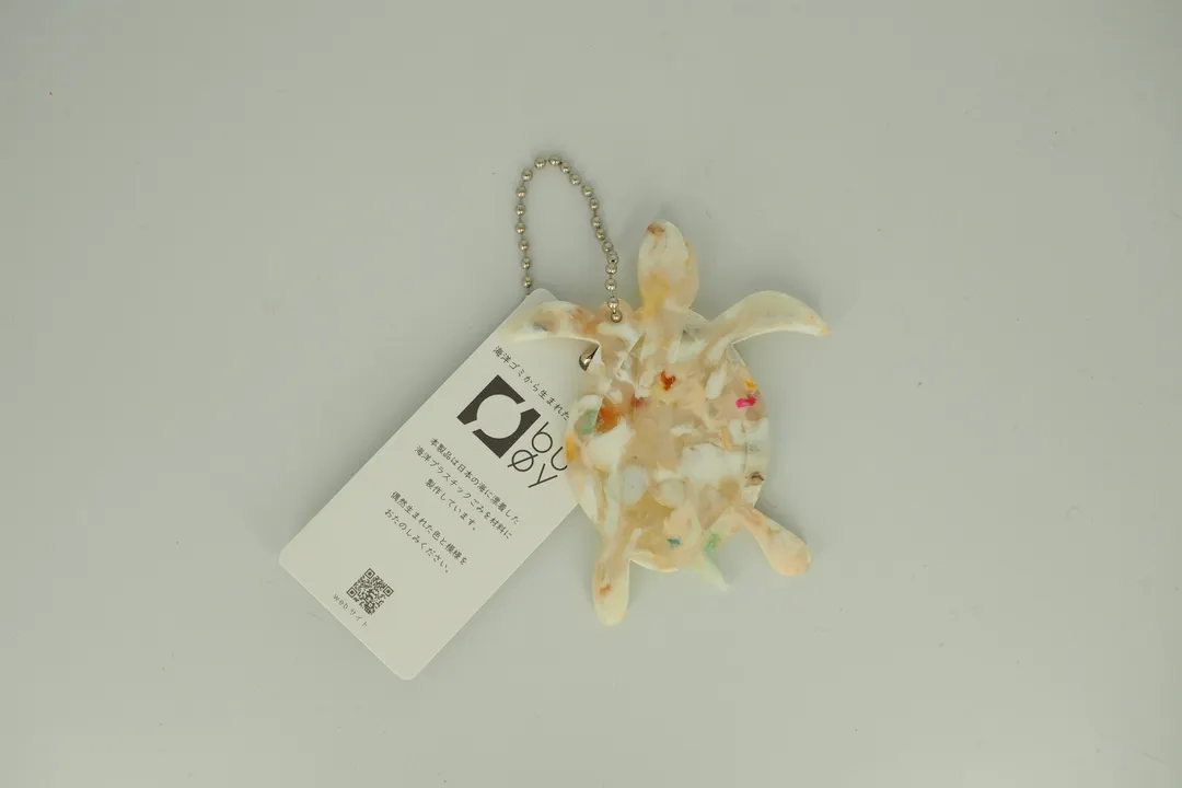 カメの形のキーホルダーです。 。 buoyの製品は全て日本各地で回収された海洋プラスチックごみを材料に作っています。着色などの加工を加えず、偶然海岸に漂着した色味でできています。 明るい発色が特徴のプラスチックですが、複数の色が交じり合うことでちょっと有機的なモザイク模様が特徴です。 製品にはひとつひとつゴミの漂着地域が明記されています。日本で起きている海洋ごみの問題をリアルに感じることができます。 また、商品に添付されているQRコードを読み込むとそれぞれの回収を行ったビーチクリーン団体さんの情報を見ることができます。 ------------------------------------------------------------------- 海洋プラスチックごみを材料に変える独自技術buoyの特徴 (buoyは海洋プラスチックごみ素材使用を前提にした株式会社テクノラボの独自技術により成形しています。株式会社テクノラボは本技術において特許取得済み) ◆材料を分けないで成形するため生まれる独自の模様 材料はすべて着色せず海洋ごみの色を活かして成形しています。偶然生まれる色と模様は回収された漂着ごみによって決まります。 ◆製品の重さが海洋ごみの重さ 製品をコーティングしているフィルム以外、混ぜ物などせず海洋ごみでできているので製品の重みから海洋ごみ問題を感じられます。 ◆製品にすべて材料の漂着地を明記 buoyは日本各地のビーチクリーンボランティアや企業の方から材料を提供していただいています。これらの材料は時期と地域を分けて管理され、製品にはすべて材料産地のシールを貼り販売しています。 buoyの材料産地をきっかけに回収された地域のことを知ってほしいとの思いからbuoyでは団体様の紹介ページを作成しています。 http://www.techno-labo.com/rebirth/partner/ -------------------------------------------------------------------