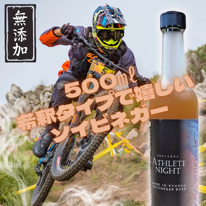 【2~7倍に薄める希釈たいぷ!】 戦うアスリートに、休む選択肢を。 細胞からストレスケア。次世代コンディショニングビネガー。 アスリートナイトは、国産大豆ふくゆたかを100%使用した発酵大豆酢(ソイビネガー) 佐賀大学との共同研究で醗酵大豆酢の中に、Nアセチルチロシンという成分が発見されました。 n-アセチルチロシンは、アミノ酸「チロシン」を吸収されやすい形にした成分で、摂取されると体内でL-チロシンに変換され、脳内の神経伝達物質の材料として使われます。 具体的には、チロシンはドーパミン、ノルアドレナリン、アドレナリンといった“カテコールアミン系”と呼ばれる神経伝達物質の合成に関与しており、これらは集中力、やる気、ストレスへの抵抗力、気分の安定などに大きく関係しています。 n-アセチルチロシンを摂取することで、ストレスや過労、長時間の集中によって減少しがちなこれらの神経伝達物質の材料を補い、思考力や精神的なパフォーマンスの維持をサポートすると考えられています。 カフェインのような刺激ではなく、神経のバランスを“内側から支える”アプローチであるため、トレーニングや仕事の後、プレッシャーのかかる場面、あるいは就寝前のリラックスにも活用できます。 スポーツやデスクワークによる脳疲労やストレス負荷を感じる人に、無理なく“続けたくなる”よう、はちみつと国産レモン果汁を加え、酸味を抑え飲みやすく仕上げました。 • フィットネス・ジム・パーソナルスタジオ等での物販提供 • スポーツサプリメントやリカバリー商品を扱う店舗様 • 健康食品EC・ナチュラル志向セレクトショップ • 頑張る大人の回復サポート”としてギフト展開にも最適