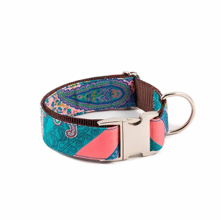 ピンクペイズリー(LIRIS・リリス) 柔らかく繊細で、春らしい色使い。とても魅力的なLiris! 既存の犬用首輪とは一線を画する、スペインならではの情熱的なテクスチャやデザインが特徴的です。 ピンク色のペイズリー柄が上品な印象を与え、愛犬と優雅な時間を楽しませてくれるアイテムとなります。ファッションアイテムとして、日常使いにもオススメです。 ? ※ペイズリー柄のデザインは生地の場所により異なります。商品やサイズによっては濃いピンク、淡いピンク、ブルーグリーンなどの色味、配色もそれぞれ異なります。 素材 裏地:ポリエステル100%リボン(エコテックス認証取得)表地:ポリエステル100% バックル:特許取得のアルミニウム製サイドリリースDリング