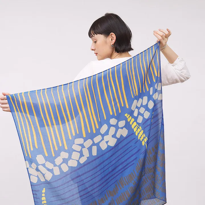 景観シリーズ。「鴨川」 まるで絵画のような鮮やかなカラーが映えるスカーフ。 綿とシルクのブレンド素材で、軽やかで上品な印象です。 鴨川の清流のような色合いと模様は、慌ただしい日常から心を落ち着かせてくれます。 shesayサイトで行ったブロックプリントコンテストで入賞したアイテムです。 ブロックプリントでは表現しきれなかった繊細な部分をシルクスクリーンプリントで表現しています。 綿は肌触りが柔らかく吸水性が高く通気性があります。 また絹は肌に優しく、滑らかで軽い質感があります。 これら綿と絹を混紡した素材は、着心地が快適で高級感のある質感があります。 【ファッション雑貨】【UV/紫外線対策】【冷房対策】【小物】【羽織りもの】【母の日】【シアー】