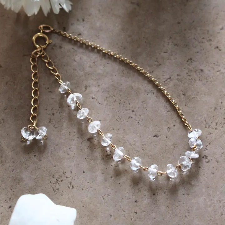 美しい透明感が魅力のクリスタルのブレスレットは 光を集めてキラキラと輝きます。 ランダムカットの天然石を使用していることで ナチュラルな天然石の魅力を 感じられるアイテムに仕上がっています。 アジャスター先端のペアの天然石が 動きに合わせて揺れる様もかわいらしく、 お守りのように身につけたい美しいブレスレットです。 クォーツ(クリスタル) KEYWORDs:浄化/潜在能力/導き ◆次回の入荷は未定です。現在のところ在庫限りの商品となります。 ~天然石のブレスレット~ 自然が長い年月を経て創り出した美しい天然石の魅力を、 最大限に感じられるようなブレスレット。 ご自分がピンとくるお気に入りの天然石が、 まるでお守りのようにも感じられるかもしれません。 日々の中で、身につけるたびに小さな幸せを感じられる。 そんなアイテムを揃えています。 ~素材へのこだわり~ RIVA GOSSIで扱っているアクセサリーの中で 基本的に、直接肌に触れるパーツ金属部分は ゴールド色は、14KGF(14Kゴールドフィルド) シルバー色は、SV925(銀92.5%/スターリングシルバー) これらの素材で制作しています。 直接肌に触れない部分に関してはメッキ素材を使用することもあります。 ページ内の原材料表示部分をご確認ください。 14KGF(14Kゴールドフィルド)とは、 かなり厚い層で14Kコーティングした素材で、 金属アレルギーを起こしにくいといわれています。 ※全ての方にアレルギーが起こらないわけではありません。 ほとんどはがれることはなく、 欧米などではポピュラーな素材です。 金メッキ素材よりも値がはりますが、 14K-18Kなどよりお求めやすく、 天然石のアクセサリーを、 より身近に楽しむことができます。 お客様に安心してアクセサリーを選んでいただけるように 素材にもこだわっています。 ◇天然石は自然が作り出したその特性上、個体差のあるものです。 可能な限り同様のイメージを保つよう選別しておりますが、 量産品ではないため、何卒ご理解くださいませ。