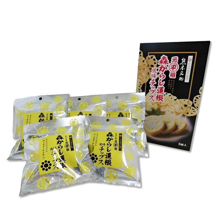 「からし蓮根のパンチある辛さと 蓮根の極上の美味さがそのままチップスへ」 からし蓮根発祥のお店、森からし蓮根のからし蓮根の熊本の代表的な郷土料理として有名なからし蓮根は、 今から 400 年近く昔の寛永九年に当店の先祖平五郎が時の藩主、細川忠利公に献上したことから始まりました。 パリッとした食感、ツーンと鼻に抜ける風味が癖になる! 一口食べるとあまりの美味しさにハマってしまい、もう一枚、もう一枚…と食べ続けてしまいます。 少しずつ食べられるので、毎日のおやつや晩酌のお供にいかがでしょうか。