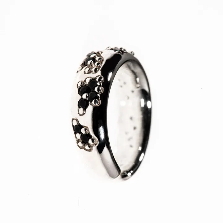 ●Description: 受注生産商品。 こちらは製作に3週~1カ月お時間を頂いておりますので、ご了承ください。 変則的なパヴェにブラックジルコニアを配置したイヤーカフ。 左右で異なる石の配置をすることで、2つの異なるバリエーションを楽しめます。 ●Material: Sterling Silver925(ロジウムコーティング) ブラックキュービックジルコニア ●Details: 幅ー4.7mm 厚みー2.2mm 内径ー11mm 空き部分ー3mm 重量ー2g