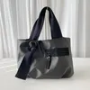 雨の日も安心な撥水ナイロンを使用し、程よいタックが女性らしいバッグです☆ 大きめのリング金具とボリュームのあるテープがインパクト大のカッコイイバッグです。 *****商品について***** ●本体は高い耐久性と摩擦に対する強度が高いコーデュラナイロンを使用しています。 ●こちらのコーデュラナイロンは通常より細番手の糸を使い、レギュラーナイロンとの組み合わせによりギラつきを抑え上品に仕上げています。 ●持ち手の結び目位置を変えて長さ調整も可能です。 ●内生地は微光沢のシャンタン生地でシックで上品な印象です。  裏地は無地の黒色になります。 ●内側両側に仕切りの付いたポケットとファスナーポケットが付いていて  整理して収納できます。 ●A4サイズもきちんと入ります。  大きめのトートなので、厚めのA4ファイルも余裕で入ってしまいます。 ●しっかりした素材なので、たくさん収納しても形崩れしません◎ ●通勤から休日まで毎日使える優秀バッグです。
