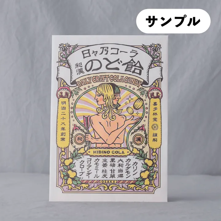 日々乃コーラ和漢のど飴の実物サンプルです。 商品導入ご検討時、実際に味や風味、パッケージ等をご確認いただくためにご用意した、特別価格でのサンプルとなります(送料無料) 💡【10種のいたわり成分配合】黒糖、和漢ハーブ、スパイスなど喉をいたわる成分をブレンド 💡【日々乃コーラの風味を喉飴に】爽やかなコーラの風味の中にスパイスやハーブが香ります 💡【奈良県産和漢ハーブ】「くすりの町・高取町」の和漢ハーブ・大和当帰の葉を粉末にして配合 💡【老舗飴菓子専門店の気品ある甘味】明治28年創業以来守られる製法で手間暇かけて炊き上げました 💡【スッキリした後味】水飴、砂糖、黒糖の絶妙なブレンドと炊き上げで優しい甘さに 💡【パリパリとした歯あたり】飴を噛む派も大満足のパリパリ食感はついつい癖になります 【からだ想いの「日々乃コーラ」の風味をのど飴に再現】 「罪悪感なく」毎日飲みたくなる日々乃コーラに、和漢のど飴が誕生。黒糖・和漢ハーブ・スパイスなど10種の「いたわり成分」を配合しました。 レトロな薬袋からインスパイアされた懐かしさも感じるパッケージは、贈り物にもピッタリな印象的なデザインです。A5サイズの袋の中には約15粒(57g)ののど飴が。 【明治28年創業の飴菓子専門店「喜多林堂」の気品ある甘味】 グツグツと鍋で炊き上げる創業以来の製法を守り、手間暇かけて作られる飴は気品を感じる上品な風味です。上質の砂糖特有のあっさりとした甘味とパリパリとした歯あたりの良さをお楽しみください。 【誰かに贈りたくなる佇まい】 2021年の発売以来、老若男女に親しまれている日々乃コーラの味わいをのど飴にしてみました。関西に根付く「飴ちゃん」を配る文化、大切な方への贈り物にもぴったりです。 優しく喉をいたわる一粒、ご賞味ください。