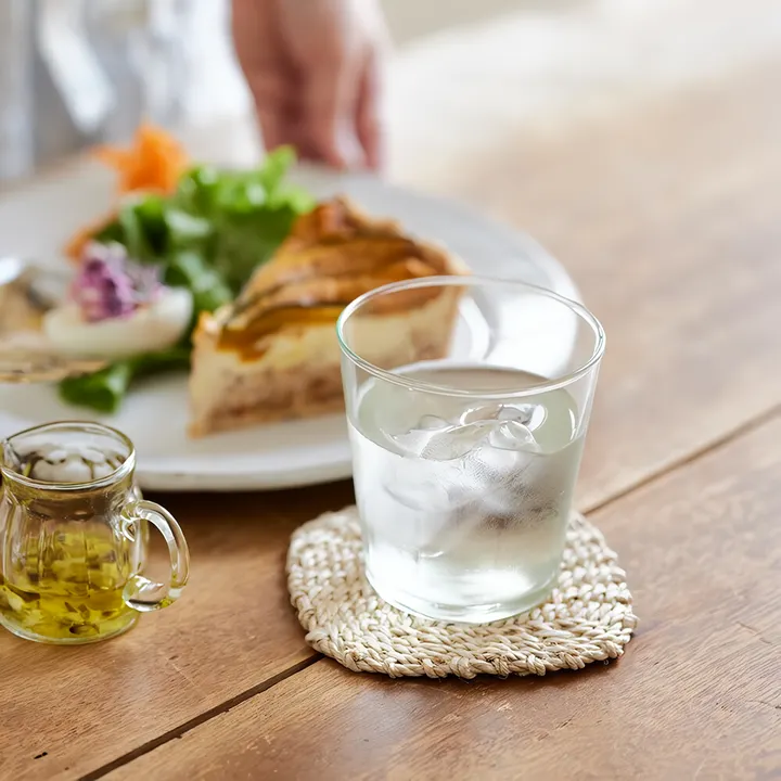 シンプルなフォルムで、どんなインテリアにも馴染むすっきりとした定番グラス。 こちらの JUCE シリーズは、気軽にジュースを飲むシーンをイメージして傾けやすいデザインにしています。 S サイズは小さな手の人や、少量だけを楽しみたい人にもおすすめです。 【リューズガラスについて】 リューズガラスとは再利用されたガラスのことで、一般的には「リサイクルガラス」や「再生ガラス」とも呼ばれています。 一度は捨てられたり不要になったガラスをリサイクルして使っているため、環境にやさしいサスティナブル( Sustainable =持続可能)な社会への取り組みとしても注目されています。 リューズガラス製品は一つひとつが職人たちの手によるハンドメイド。 炉(ろ)で溶かしたガラスを竿(さお)ですくい取り、型の中で息を吹き込みながら作る「型吹き成形」という技法で、たとえ同じ型のシリーズであっても、全く同じ仕上がりになるということはありません。 ガラスの流れや小さな気泡、口の部分に盛り上がった箇所などがあったりしますが、これは吹き竿からガラスをカットした後、熱処理した時にガラスが流れてできるもので、これもまた吹きガラスの特徴です。 ハンドメイドならではの、ガラス表面に生まれるわずかな“しわ”や小さな気泡、繊細な表情の違いなどをお楽しみください。 ※リューズガラスは再生ガラスを使用した当社商標登録商品です。