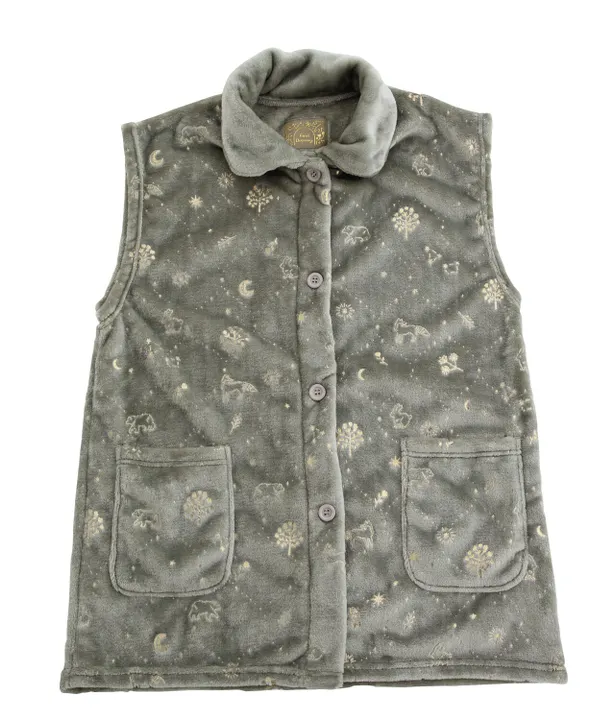 なめらかな手触りのフランネルとあたたかなボアで、うっとりするような夢見心地に。 厚みのあるフランネルとゴールドの箔プリントが人気の冬の定番防寒シリーズです。 今年はキルティングのようなライン模様を忍ばせてみたり、例年よりも柄の密度が高く、キラキラした箔プリントの特徴がより分かりやすくなっています。 ルームベストは一枚仕立てで軽い着心地と暖かさを兼ね備えていて毎年人気です。 下にしっかり着こんでも大丈夫なように袖ぐりを大きくとっています。動きやすくお尻が隠れる丈感もポイントです。 厚めの襟で、襟元を立てると首元があたたか。 フランネル生地は静電気防止糸を使用しているため、不快なパチパチともサヨナラできます。 左右にスマホが入る大きめポケット付きです。