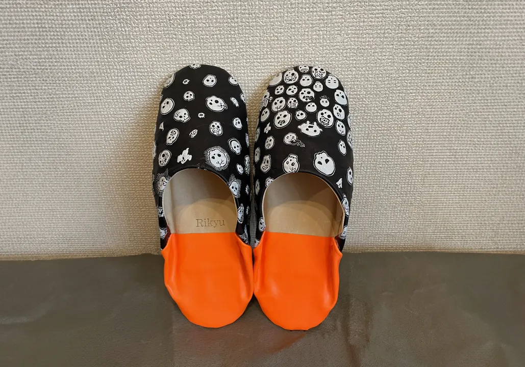 贅沢な全面革仕様のルームシューズ。 丸くて柔らかい形が人気のバブーシュ型です。 モロッコ製のものは,独特の匂いがしたり,色落ちすることがあったり,少し不安な方もいらっしゃるかと思います。 こちらは日本で作られたバブーシュで,接着剤もラバー系を使用しているので安心です。 見た目のガイコツ柄でインパクト抜群。踵はネオンカラーでポップに仕上げました。 カラーはクロとヤマブキの2カラー用意しています。 クロはネオンオレンジと合わせてポップに、ヤマブキは独特の染めムラをネオンブルーと合わせました。 汚れやすいルームシューズも、この革は表面水拭きできますので安心です。 薄くて軽い革を使用してますのでとても軽く,片足わずか75g。 中敷にはフカフカのスポンジ入りで履き心地抜群です。 底面は床面(革の裏の起毛面)を使用し、フローリングでも滑りにくく安心です。汚れが目立たないよう底はグレーの革色です。 コーティングしていない素上げ革を使用していますので、足馴染みが良く、通気性も良く、気持ち良く長くお使いいただけます。 サイズ展開もユニセックスで5サイズありますので、足の小さい方から大きな方まで対応できます。 ⚫︎大阪の革の街から職人メイドの商品をお届けします。 商品が生まれる場所は大阪の革の街。 昔から皮革関係の会社や工場が多い地域ですが、年々その数は減ってきています。 そんな中で革に魅了された若い職人たちが、自分自身の腕を磨きながら数少ない後継者として働いています。 そんな職人仲間と共に、見慣れた革製品とは違うものを作ろうと立ち上げたレザーブランドです。 商品には、コラボレーションしている職人のサインや屋号も一緒に入れています。 ⚫︎親子2代のみで染める革 POCOLOCAの軸は素材です。一見革とは思えない質感の凸凹しわしわのガイコツレザー。 これは革の染め職人が失敗から発見し、凸凹の加減を染料により調整することに成功し新しい染色方法として確立させた驚きの染色技法で作られています。 独特の染めムラがどこか民藝的な温もりを感じさせます。 海外でも注目され,大阪の染め工房には外国人観光客が足を運んで商品を買い求めることもあるそうです。 POCOLOCAはこの染めでオリジナルのガイコツ柄を新たに製作し、ここでしか作れない完全オリジナルの革で商品を作っています。 *こちらの商品はひとつひとつ模様の出方が変わります。柄の指定などは一切できません。柄の出方はお任せになります。ご了承ください。 ・・・・・・・・・・・・・・・・・・・・・・・・・・・・・ ⚫︎Collaborated Creators【Room shoes maker Rikyu】 元lady'sシューズのデザイナー&靴職人が作るバブーシュ専門店。動物やフルーツをモチーフにした履くだけで幸せになれるカラフルで楽しいバブーシュを作っています。 ⚫︎カラー クロ 甲/ガイコツ柄クロ 踵/ネオンオレンジ 裏/ベージュ ⚫︎サイズ(内寸、木型サイズ) XS:22,5cm S:23,5cm M:24,5cm L:25,5cm XL:26,5cm ⚫︎素材 牛革、豚革、山羊革、ウレタンスポンジ ⚫︎生産国 日本