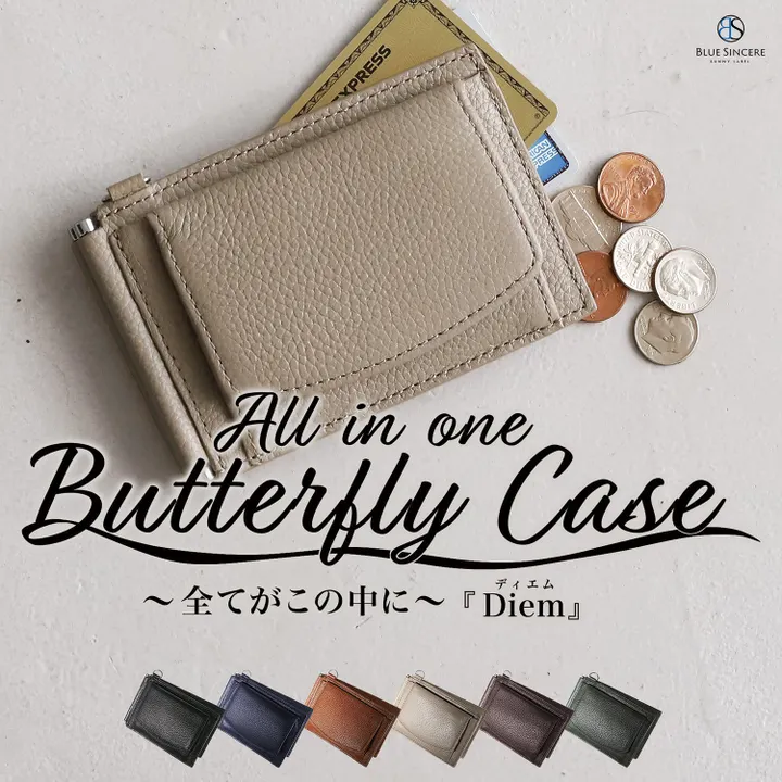 パスケース 小銭入れ 薄型 本革 メンズ レディース バタフライ カードケース 透明窓 免許証 定期入れ キーチェーン付き 多機能 / PC8 Diem ディエム グレージュ