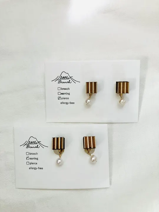 毎日の半歩先へ。 地域の木を身につけることを日常に。 地域の木、主に愛媛の木を使ってアクセサリーを作っています。 森林大国である日本の木を使ったものを身近にすることで 木の良さ、またその先にある森林への繋がりを感じてもらいたいと思っています。 小さなしましまのモチーフに淡水パール。 イヤカフなどとの重ね付けも可愛いです。 通常は縦じまにてお作りします。 横じまでの製作ご希望の場合は発注時にご連絡ください。 【ピアス金具】 ポスト:ステンレスまたはチタン キャッチ:シリコン 金属アレルギーを起こしにくい素材を 使用しております。 【イヤリング金具】 痛くなりにくくずれにくいクリップ式の金具です。