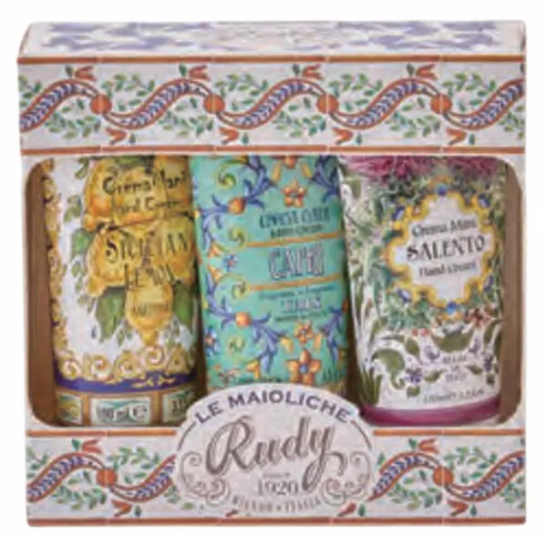 〇Rudy会社概要 ミラノの西アッサーゴにあり、100年の歴史を持つ老舗コスメ工場、ルディプロフィーミが日本の家庭にイタリアの太陽と草花の香りを運んできました。1920年から始まり、今では三代目の三人の孫たち、Giorgio(ジョージオ)、Lorenzo(ロレンゾ)、Cristina(クリスティーナ)がそれぞれの才能を発揮しながら、昔からの伝統を守りつつ、現代の市場にあった新しい商品を生みだしています。 〇Le Maioliche ラ・マヨルカ イタリアのルネサンス時代に発祥した白地に色鮮やかな色彩を施したマヨルカ焼き【マジョルカ焼きとも呼ばれる錫釉陶器(すずゆうとうき)】は、スペインのマヨルカ島を経由してシチリアに入ってきたことでその名が付きました。主にストーリー性を盛り込むことが多い焼き物で、歴史上の出来事や伝説が描かれることが多かったそうです。このイタリアの歴史を担った伝統工芸へのオマージュであり、イタリアの各地域のすばらしさを伝えるモチーフとしてマヨルカ焼きの柄を施したシリーズが、ルディ「ル・マヨルカ」です。 〇Hand Cream Gift Set ハンドクリーム ギフトセット 人気のハンドクリームをギフトセットにしました。 〇Fragrance-フレグランスの種類- ・Stella ステラ Mediterranean Herbs メディタラニアンハーブ・Amalfi Peony アマルフィピオニー・Sicilian Orange Blossom シチリアンオレンジブロッサムの3種類のハンドクリームセット。 ・LUNA ルナ Sicilian Lemon シチリアンレモン・Iris of Capri アイリスオブカプリ・Salento サレントの3種類のハンドクリームセット。