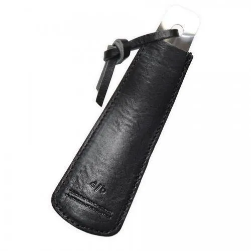 携帯する革製シューホーン(靴べら)です。ステンレス製の靴べらを革でくるみ、フラップを付けたのでフック等に吊り下げれます。 コンパクトサイズなので、トレイに入れたり、バッグやポケットに入れて持ち運びもできます。 素材はイタリア・サンタクローチェ地方のタンナー:アテナ社のバケッタレザー: INGRASATO(シュリンク)を使いました。 サイズ:約 160 × 50 × 22 mm 外 側:INGRASATO(シュリンク) 内 側:ステンレス 色・柄:BLACK、BROWN、NATURAL 個 装:上下貼り箱 名入れ:不可