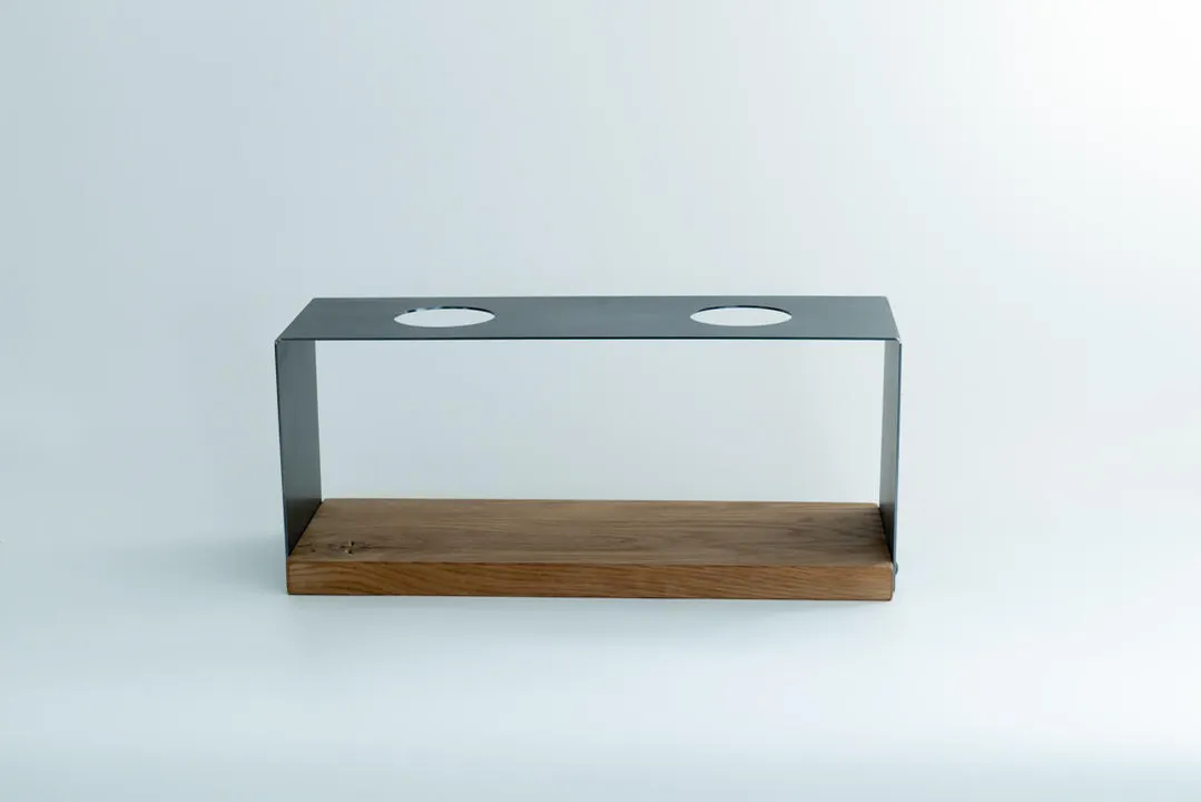 コの字型の造りのダブル用ドリップスタンド。 鉄板を曲げて作ったこちらは鉄工所ならではのアイテム。オーク材の台座を取り付けることで洗練されつつも優しい印象となっています。ハンドドリップでコーヒーを抽出する際の時間のおともにどうぞ。 クロとシルバーの二種類からお選びください。