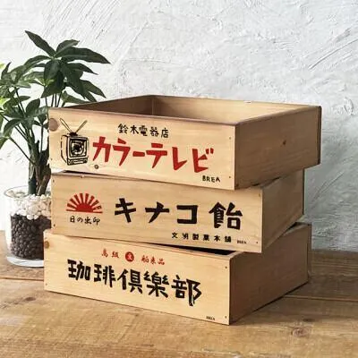 北海道 旭川市の自社工場で製作しています 駄菓子屋さんの店先にありそうな レトロ文字プリントの木箱 キッチンでレトルト品の整理に使ったり お菓子のストックを入れてもカワイイ。 北海道産パイン材使用。 ■商品サイズ 約 横幅280×奥行230×高さ80mm (板の厚みなどで、多少の誤差が出る場合があります) ■材質 北海道産パイン材を使用。底板は合板。 木目、色合いなどが1つ1つ違います。