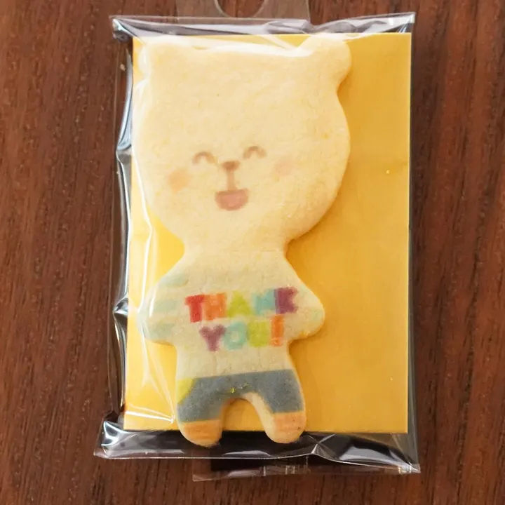 「THANK YOU」のメッセージ入りの米粉が入ったリリクッキー。 色はブルーです。 「THANK YOU」だけのメッセージは、様々な感謝とお礼に幅広くお使いいただけます。 美味しさだけでなく、可愛さ、メッセージ付きで、プレゼント用としての需要もあるクッキーです。