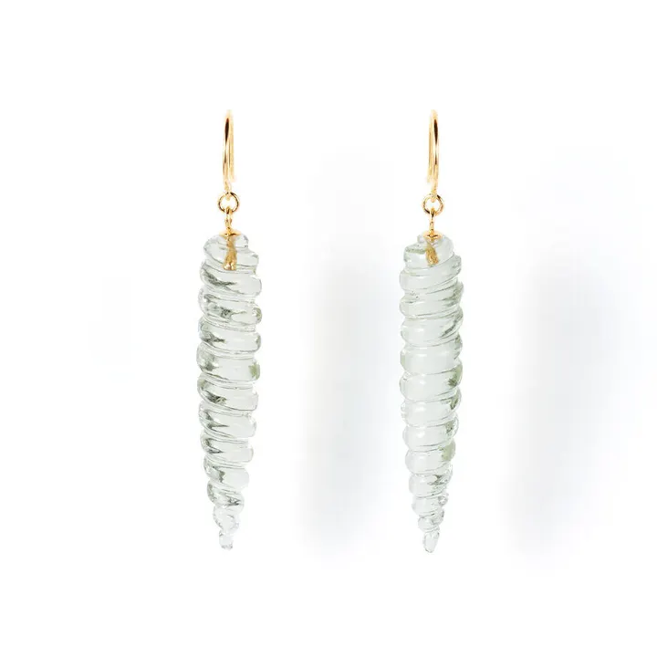 K18YG グリーンクォーツ ピアス IGE-006E 揺れるたびにキラキラ輝くカービングがポイントのピアス デザイナーが厳選した天然石に、痛みの職人による繊細な加工が施され、仕上げられたジュエリー Made in Japan ※カットの石は一つ手作業でカッティング・カービングされています。画像のイメージと異なる場合がございます。デザインとして許容しております。一時ご了承ください。 ※照明の関係により、実際よりも色味が違って見える場合があります。 またパソコン・スマートフォンなどの環境により、一部の製品と画像の色が異なる場合もございます。予めご了承ください。 _モチーフ片側 H:約41mm W:約7mm (おおよそのサイズ)