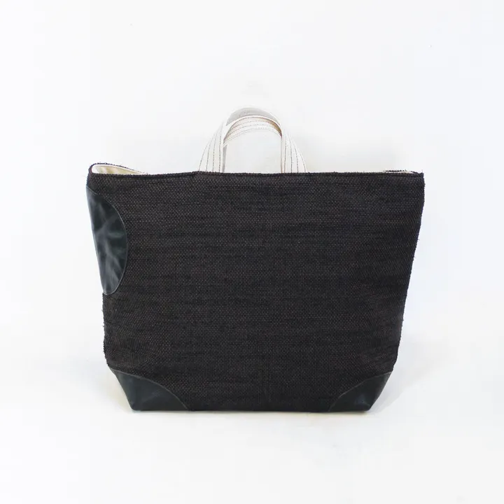 「もったいないを、もっとゆたかに」をコンセプトに。 サスティナブル(持続可能)なものづくりを目指す取り組みの一環として、 蚊帳の日常着を作る過程でどうしても出てしまうあまり布を、 糸状にカットし、時間をかけて一段一段丁寧に織りあげました。 ステッチのようなテキスタイルがおもしろく、 手仕事ならではのあたたかみがあります。 本革のアップリケがおしゃれなトートバッグは、デイリーユースにぴったりです。 岩手県で「裂き織」を手掛けている 『幸呼来(さっこら) Japan』さんとコラボレーション。 寒冷な気候のため古くから布が貴重とされてきた東北地方では、 日常生活で使う衣類や布団をくたびれても捨てず、細く裂いて繊維状にし、 再び織り上げ活用してきました。 「使い切る」という文化の中で発展し、 受け継がれてきた独自の技術が「裂き織」です。 持ち手部分は麻の帆布で出来ており、使い込むほどに馴染んでいきます。 16cmのマチをとり、書類やタブレット、小型のノートパソコンもらくらく入る サイズ感なので、お仕事用としても活躍しそう。 [サイズ/組成] 32cm×32cm×16cm 素材 本体・裏地 綿 100% 持ち手・見返し 麻100% アップリケ牛革(墨・藍・つるばみ)山羊革(香色)  マグネット付き 内側ポケットあり