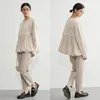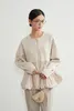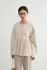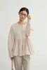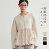 ◆生地 伸縮性のあるダンボール素材と、軽やかな布帛をドッキング。異素材のコントラストで、立体的なシルエットを美しく表現しました。肌触りも柔らかく、着心地の良さも魅力です。 ◆デザイン 裾に丸みを持たせたバルーンヘムが特徴のブルゾン。ギャザーの入った立体的なシルエットが、甘すぎず大人っぽい印象を与えてくれます。ドロップショルダーとゆったりした袖が、リラクシーでありながら女性らしい雰囲気を演出。フロントはジップ仕様でモード感をプラスしました。 ◆コーディネート シンプルなボトムスに合わせるだけで、主役級のスタイリングに。テーパードパンツできれいめに、ワイドパンツやデニムでカジュアルに、スカートでフェミニンにも着こなせます。オン・オフどちらでも活躍する万能アウターです。 単位(cm)モデル身長167cm サイズ FREE  着丈 64/67 バスト 96 裄丈 74 素材:レーヨン50%、ポリエステル45%、ポリウレタン5% 別布:ポリエステル73% ナイロン27% 中国製 透け感:なし 生地の厚さ:普通 光沢感:なし 裏地:なし 家庭洗濯:可能 ◆商品ストーリー 「シンプルだけど、どこか特別感がある服を作りたい」 そんな想いから、このバルーンヘムブルゾンは生まれました。 裾のふんわり感を出すためには、布帛の分量とギャザーの入れ方が重要。しかし最初の試作では広がりすぎてしまい、理想のシルエットにならず…。何度も分量を調整し、軽やかさと丸みを両立させるパターンを探り続けました。 また、異素材の切替えも大きなチャレンジ。ハリ感のあるダンボール素材と柔らかな布帛の相性を見極めるのに時間がかかりましたが、最終的に「動いたときに美しく映える」組み合わせにたどり着きました。 完成した一枚は、羽織るだけで女性らしい立体感を纏えるアウター。甘さとモード感を絶妙にミックスし、毎日のスタイリングを少しだけアップデートしてくれる存在です。