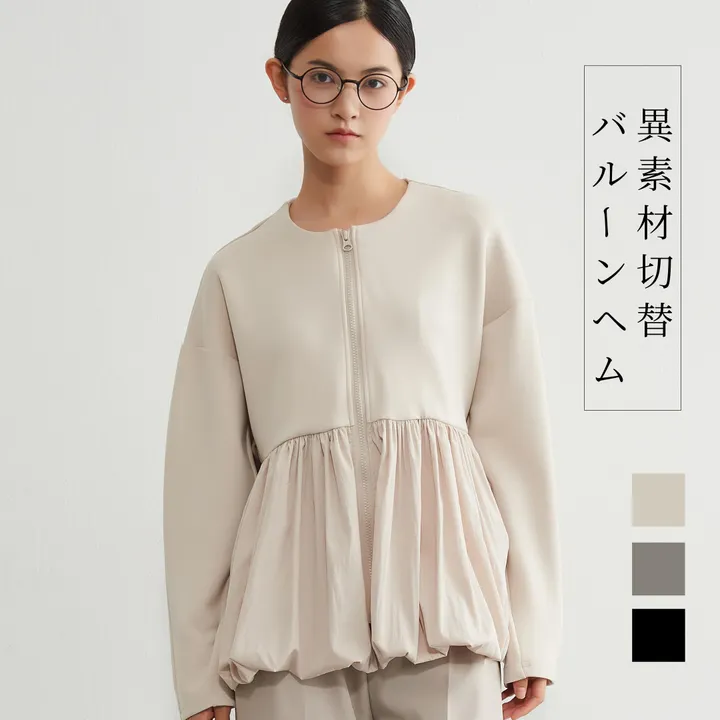 異素材切替 バルーンヘムジップブルゾン 立体スリーブ レディースアウター BEIGE/FREE