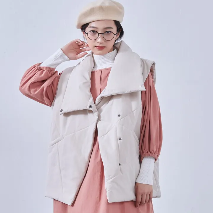 KNNJ359-アシンメトリー・ビッグカラー・中綿ベスト・秋冬アウター・アウトドアベスト CREAM/FREE