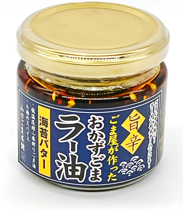 ラー油を作った後の旨味の詰まったスパイスにごま油とごまと干しのりを加えて作ったおかずになるラー油です。 一番搾りのごま油と7種のスパイスに干し海苔とバターで旨味を引き出した、化学調味料・保存料無添加です。 ご飯のお供やラーメン、冷奴などによく合います。
