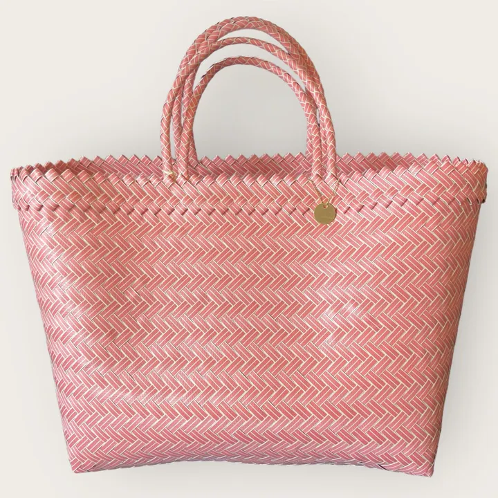 パサールバッグ ホワイトストライプピンク (パステルピンク地に白のライン) インドネシアのお母さんが手編みで作るプラカゴバッグ、 パサールバッグは、 軽くて丈夫で水洗いが出来ます。 PPバンドというプラスチック製の平たい紐で編まれていて、 驚くほど軽く、 重たい物を入れても壊れません。 水洗いが出来るので、 屋外で直置きしたり、 汚れ物を直接入れることが出来ます。 洗ってく繰り返し使えて、 丈夫で壊れないので、 長く使えて環境にも配慮したアイテムです。 デザインもシンプルで飽きが来なく、 カラーバリエーションも豊富です。 小さいサイズは日頃のお出かけに、 大きいサイズはエコバックやレジャーバッグに、 毎日の生活で快適におしゃれに持って頂けるバッグです。 ========================= 製品の背景 インドネシア語で 『PASAR(パサール)』 は『市場』という意味。 インドネシアには市場がたくさんあり、 新鮮な野菜や果物、お花などが売られています。 お母さんが手編みで編んで、 市場での買い物に使うカゴバッグとして、 パサールバッグは昔からインドネシアの人の生活の中にあります。 世界的にカゴバッグがファッションアイテムとして認知された今、 パサールバッグはジャワ島の田舎のエリアの主婦の内職の仕事となっています。 田舎のエリアは都心部と違い仕事が少ないため、 カゴを作る内職は貴重な収入源となっています。 ======================== DONATION kashiのパサールバッグには kashiのロゴ入りの真鍮チャームがついています。 このチャームには寄付が含まれていて、 チャーム付のバッグが一点売れるたびに30円の寄付が、 インドネシアバリ島を拠点に活動する環境団体 『SUNGAIWATCH』に寄付されます。 スンガイウォッチはプラスチックゴミの海洋流出を減らすため、 様々な活動をするフランスの団体です。 ======================= ご購入時の注意点 ロットにより色味が若干異なる場合があります。 海外製品のため一点ずつ形や大きさ、編み方の違いなどがあります。 テープに若干の色むらや、ねじれ、傷が入る場合があります。 海外での手作り品のためご了承下さい。(明らかな不良品の場合は検品にてはじいております。)