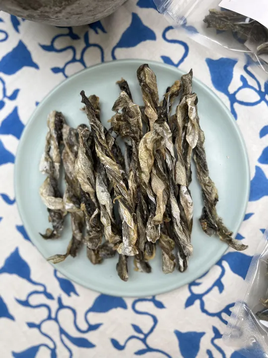 商品製造過程で出てくるタラの皮は普段は使い道がないということで いままで捨てていたとのことなのですが、 mellowbearにてフードロスになっている食材を活用して、 アップサイクルしていることを知り、何か使えないかなとご連絡をいただき実現いたしました。 アップサイクルの輪が広がってとっても嬉しいです。 しっかりとした硬さもあるので、歯磨きにもぴったりなタラの皮。 低カロリー高タンパクな魚として、OMEGA3やコラーゲンでとっても栄養価たっぷりです。 また、カリカリと食感が楽しく大型のワンちゃんにも満足いただけるアイテムです。 また、タラは、消化にも優しいという特徴があるので高齢なわんちゃんや 消化器系が弱いというワンちゃんにもにもとってもおすすめです。 原材料 ・たらの皮