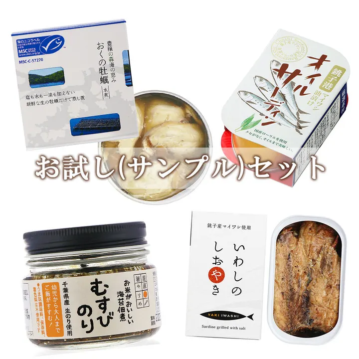 千葉産直サービスのお試し【B】セット 「おくの牡蠣缶」「銚子いわし缶2種」「ちばの海苔佃煮」4種お試しセット (各1個) ※トロ缶シリーズを除く (内容) ● 岡山県邑久町産「おくの牡蠣」缶(150g) ※MSC認証品 牡蠣が好きな方なら、一度は食べてほしい。 説明がいらない、国内唯一の牡蠣の素材(蒸し煮)缶です。 ● 銚子産 まいわしのオイルサーディン缶(100g) 素材派の方に長く支持されている、 ハーブ香る銚子産マイワシのオイルサーディン。 ● 焼き魚の缶・銚子産 いわしのしおやき缶(100g) 日本の定番朝食「いわしの塩焼き」を、骨まで柔らかく・ふっくらとした缶詰に。 焼き魚の香ばしさに、上品な燻製の余韻をまとわせた、料理屋品質の一品です。 ● 千葉県生のりでつくる海苔佃煮「むすびのり」(90g) ※びん ご飯が止まらない。希少な千葉県産“江戸前生のり”でつくる、無添加のり佃煮。 素材の違いが味の違い。ひと口ごとに本物の旨みが広がります。 ※詳細は各商品ページご参照ください ◎ 千葉産直サービスの魚缶とは。 「旬を感じる“1ランク上”の魚缶」 私たちの主力である水産缶詰は、魚の「旬」「質」「味」に徹底してこだわった“1ランク上の魚缶”です。変化し続ける海洋環境の中で、365日のうち限られた「旬」の時期から、最良の魚(サイズ・品質・脂のりなど)だけを厳選しています。 “旬の魚のおいしさを知ってほしい”―その想いが、私たちの魚缶の原点です。 ◎ 素材と調味料へのこだわり 主役である素材を引き立てるため、副原材料にいたるまで“何から作られているか明確”な無添加の本格調味料のみを使用しています。
