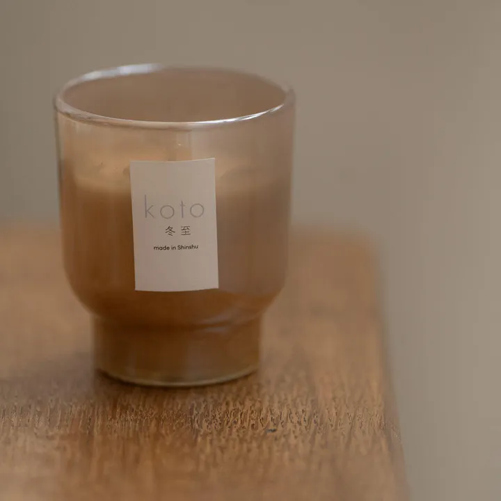 kotoの自社アトリエで作る四季巡る二十四節気のキャンドルは、厳選した原材料を配合し、ブレンドや調合、箱詰めまで一点一点職人の手によって心を込めてしつらえています。 大豆とアブラヤシの天然ワックスを独自にブレンドし、香りの拡散と持続、燃焼効率に優れたハンドメイドキャンドルをお届けします。 一年でもっとも昼が短く、夜が長い頃――冬至。 寒さを乗りきるために、かぼちゃを食べて栄養を蓄え、柚子湯に浸かって無病息災を願う習わしが今も受け継がれています。雪の下では靭草や麦の芽がひっそりと芽吹き、あたたかな春を静かに待つ季節です。 「冬至の香り」は、冬の空気そのものを閉じ込めたようなフレグランス。 澄みきった空気、やわらかな陽だまりの午後――その一瞬を瓶にとどめたかのように、心地よい秋の情景を運んでくれます。 まずトップノートでは、シナモンとシトラス、そしてマム(菊)が重なり合い、スパイシーで華やかな香りが軽やかに広がります。 続くミドルノートは、青りんごやベリー、グリーンリーフ。みずみずしい果実感と爽やかなグリーンが調和し、秋らしい実りの豊かさを感じさせます。 そしてベースノートでは、ピーカンナッツのやわらかな甘さとシダーウッドの落ち着きが余韻を包み込み、木漏れ日に佇むような温もりを漂わせます。 天然精油には、シナモンリーフやシナモンバークのスパイシーな深み、パチュリやシダーウッド、ベチバー、サンダルウッドが調和し、香りに奥行きと落ち着きを加えています。トップにはホワイトセージをあしらい、見た目にも冬の澄んだ空気を映しました。 スパイスと果実の神秘の余韻が、長い夜を幻想的に彩り、心に特別な温もりと深い安らぎを授けてくれます。 二十四節気の移ろいに寄り添うように、kotoのキャンドルはすべて厳選された原材料を用い、自社工場で一点一点、手作業で仕立てています。ワックスの配合や芯の細部に至るまで丁寧にこだわり、美しく灯りと香りを楽しんでいただけるよう心を込めています。朝の始まりから夜のひとときまで、季節の気配を感じる香りが日常に溶け込み、暮らしのリズムにそっと寄り添ってくれます。 また、キャンドルを包むグラスは、使い終えた後に湯煎して洗うことで、繰り返しお使いいただけます。kotoがご用意する別売りのティーライトキャンドルを中に入れて灯せば、二十四節気の香りをより気軽に楽しみ続けていただけます。香りと灯火を長く愛でながら、持続可能なかたちで季節の移ろいを感じていただけるように、私たちはものづくりに心を尽くしています。 【使用上の注意】 灯している時はキャンドルのそばから離れないようにしてください。一度に2時間以上の燃焼はおやめください。長時間燃焼すると、グラスが大変暑くなり破損する恐れがあります。芯が長くなったり曲がったりすると火が大きくなったり、黒い煙が出やすくなります。灯す前に芯を7mm程度にカットし、整えてください。お子様やペットの届くところでの燃焼はおやめください。