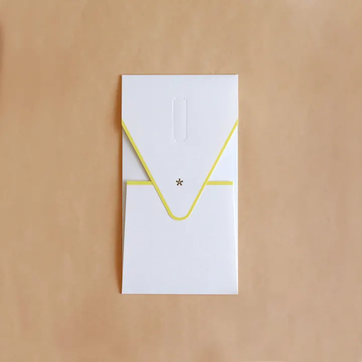 潔く上品な佇まいの祝儀袋。結婚祝いや入学や卒業のお祝い、快気祝いなどさまざまなお祝いのシーンで活躍します。紙器設計の技術でできたフォルムとアクセントカラーが心地よいデザインの製品です。 Redは、最もオーソドックスで華やか。人生の節目となる大切な門出に、伝統を大切にしつつ、個性を光らせたいシーンに最適です。Greenは、芽吹きを感じる瑞々しさがあります。新しい生活の始まりや、お子様の成長を願うお祝いに。性別を問わず贈りやすい、爽やかなカラー。Yellowは、光のように明るいYellowは、手渡す側も受け取る側も笑顔にする色。堅苦しくなりすぎず、お祝いの気持ちをを軽やかに伝えます。 紙の道具「紙器具(しきぐ)」を扱う大成紙器製作所らしい解釈で再設計された新しい形。 付属の「御祝」、「寿」シール、名前を記入できるシールは、紙自体に凹みをつけるデボス加工によって緩やかにガイドされています。デボス加工の影がより特別感を演出。華美な水引などもないためリサイクルも容易です