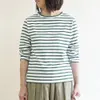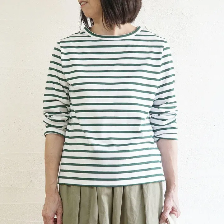 アクセントになる大人かわいい柔らかボーダー 【天竺ボーダー・長袖T】 柔らかな天竺素材を使った長袖のボーダーTシャツ。 セットインなのでカジュアルになりすぎず、大人に似合う可愛さのあるカジュアルスタイルに。 ちょうどいい着丈、大きすぎず程よくゆったりしたシルエットで合わせるボトムを選びません。 一枚で着るのはもちろん、ベストやジャケットなどのインナーにもおすすめです。 程よくゆったりしたシルエット。 セットインできちんと感のあるデザイン。 両サイドにスリットあり。 柔らかく優しい肌触りで、着心地の良い素材です。 薄すぎず厚すぎない、ちょうどいい厚みでオールシーズン活躍してくれる生地感です。 <モデル:166cm> ◆お取り扱い上のご注意◆ ・この製品の生地はナチュラル感を出すため、糸の節目、ネップ、カスを取り除かずそのまま織っています。また、素材の持ち味を生かして自然な風合いに仕上げるため、加工工程上一部折れスジ等がありますが、それらは加工特性のため不良としてカウントしておりませんので、予めご了承ください。 ・色の濃い製品は着用や洗濯時に表面が毛羽立ち色合いが変化、色落ち移染する場合がありますのでご注意ください。 ・洗濯後の脱水は短めにし、形を整えて速やかに干してください。 ・洗濯機をご利用の場合はネットをご利用ください。 ・蛍光増白剤入り洗剤、漂白剤、タンブラー乾燥のご使用は生地の傷みや収縮の原因となりますためお控えください。 ・素材、染色の案形状色落ちする場合がございますので白物とは分けてお洗濯ください。