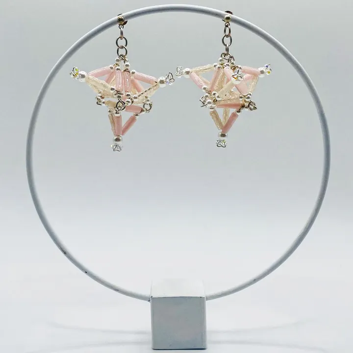 テキスタイルシリーズ◯PinkCotton×Lace◯ 細長い竹ビーズを残布の綿とレース布を使用し、一からビーズを作っています 仕上げにコーティングしているので水に濡れても丈夫な仕様となっています こちらの残布は私が洋服制作の時に出た残布です 綿とレースの2種を組み合わせてデザインしました 3DStarよりサイズが小さい為、星屑[Stardust]と名前をつけました 先の方にはスワロフスキーが付いていて 揺れた時に輝きがさらに増すデザインになっています ⁂mUIk UPCYCLE Story⁂ 衣服の大量生産・大量消費が拡大し、ライフサイクルの短期化によって大量破葉に繋がっているこの現状にファッションが大好きな私にとってとてもショッキングなことでした。 ただ捨ててしまう衣服や残布を私もなりにどうにか再利用することができないか考えた時 出来上がったのがこの作品です。 ほんの少しのことかもしれませんが少しでも持続可能なことに貢献できたら幸いです。