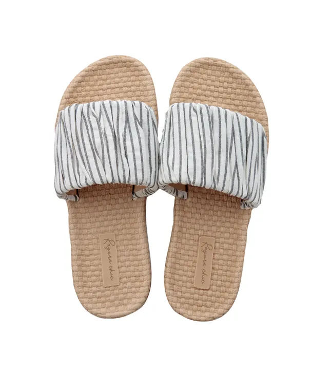EVA樹脂製の軽量ソールを採用した、お手入れしやすい春夏定番スリッパです。 細いストライプ柄の生地にギャザーを寄せて、ナチュラルで女性らしい雰囲気の一足になりました。 桜、新緑、雲などをイメージさせる、自然で清涼感あるカラー展開です。