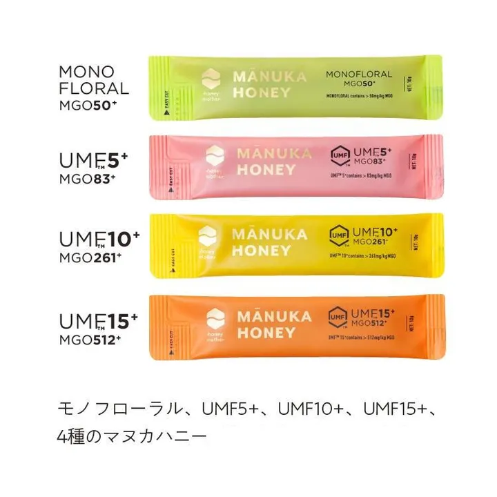 ■スティック マヌカハニー(モノフローラ/UMF5+/UMF10+/UMF15+) 内容量 :10g×各1本 賞味期限:期限まで2年以上の商品を発送いたします 原材料:100%純粋天然非加熱はちみつ 原産国:ニュージーランド 保存方法 /直射日光を避けて冷暗所 希少なUMFマヌカハニーを1日の摂取量にちょうどいい10g(小さじ約1.5杯)にパッキング!いつでもどこでも、サプリ感覚でお召し上がりいただけます。旅行やお子様の遠足、スポーツ時の体力回復にも◎ ■注意 ・一歳未満のお子様・はちみつアレルギーの方はお召し上がり頂けません ・妊娠・授乳期は問題なくお召し上がり頂けます ・マヌカハニーは採取時期・地域によって色味が異なる場合がございますが、品質面での影響はございません。