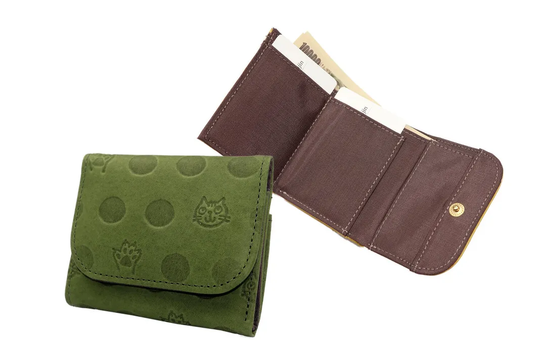 お札・小銭・カードを全部纏めて手の平サイズに!猫と肉球の牛革手乗りコンパクト財布・日本製 グリーン