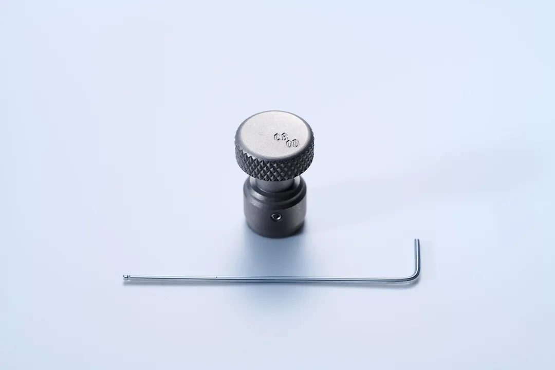 ST-310・340、ST-330専用のノブ オリジナルには四角いワイヤーが火力調整ツマミとして付いているのだが正直回しづらい。 火力調整がすみやかにできるよう筒型の個体へと変更。 ST-310,340用のノブはくびれのおかげで、折り畳んでも脚にぶつからないデザイン。